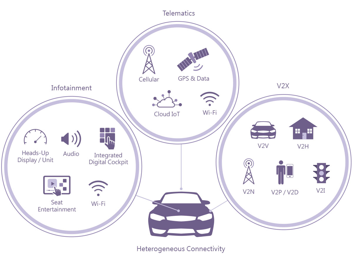 - Connected cars are ideal for developing an ecosystem around the Internet of Things. We plan to connect to everything (V2X) - share information on many vehicles.